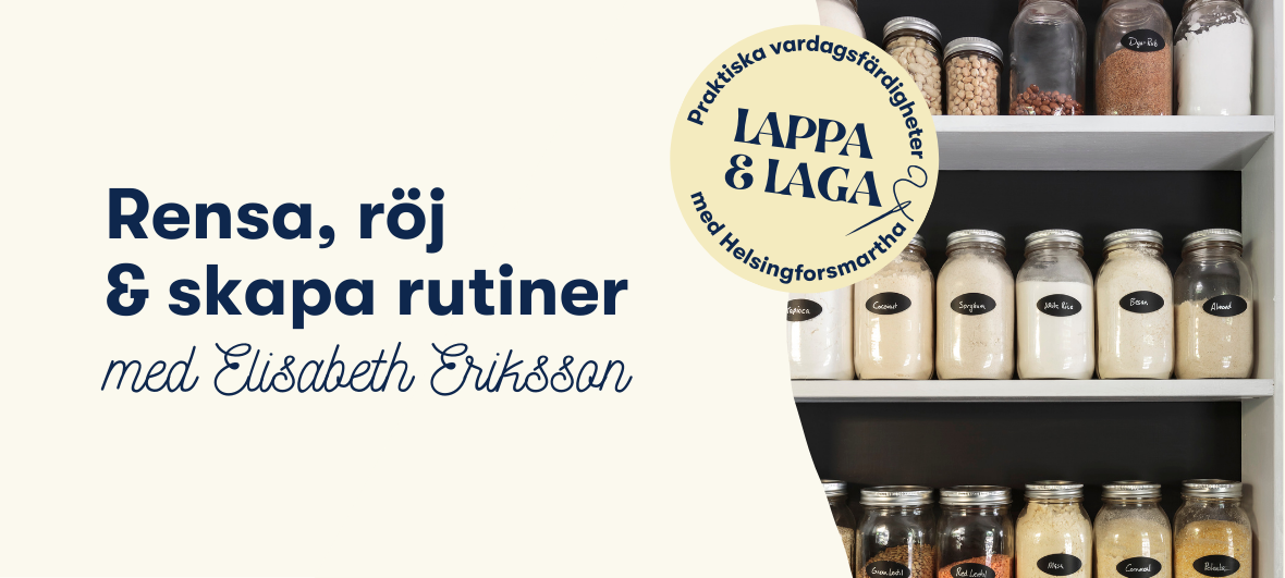 Denna kväll fokuserar på hur man kan skapa bättre ordning i hemmet genom att rensa, röja och se över sina vardagsrutiner. Under ledning av Marthaförbundets hushållsrådgivare Elisabeth Lissu Eriksson funderar vi och diskuterar vad som gör ett hem - och en vardag - fungerande . Det handlar inte om att ha det perfekta hemmet, utan om att ha ett hem som passar dina behov och underlättar för vardagen.