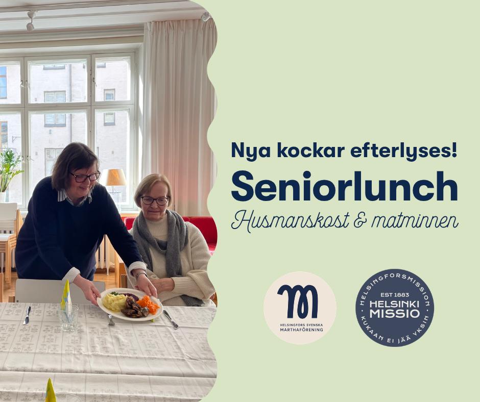 Seniorlunchen är ett samarbete mellan Helsingfors svenska Marthaförening och HelsingforsMission. Luncherna har haft runt 30 besökare per gång och ordnas den tredje tisdagen i månaden kl. 12.30-14 i september–december och januari–april, alltså fyra gånger per termin. Seniorer som ofta äter ensamma eller saknar matgemenskap kan träffas över en hemlagad lunch och prata matminnen.